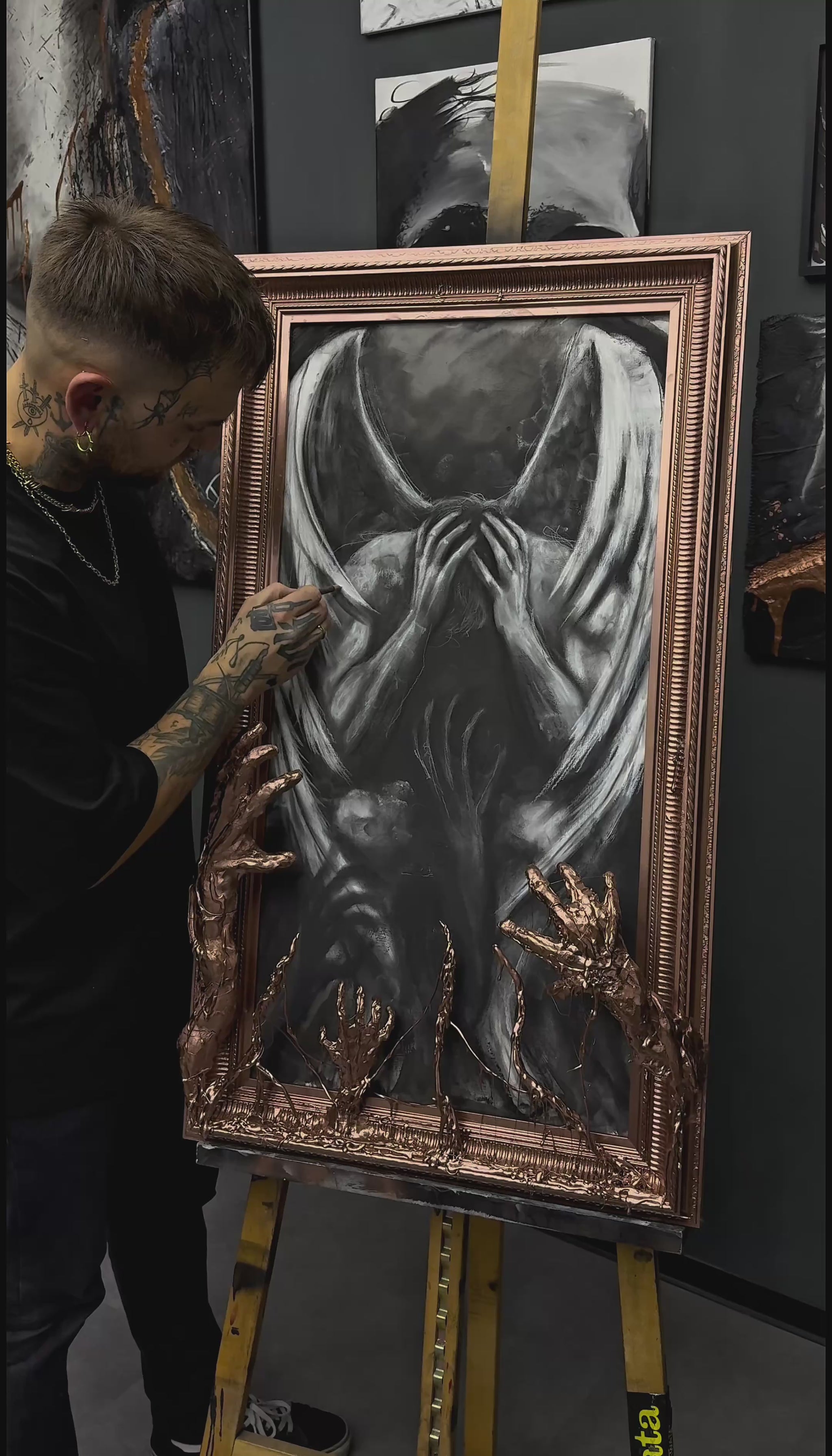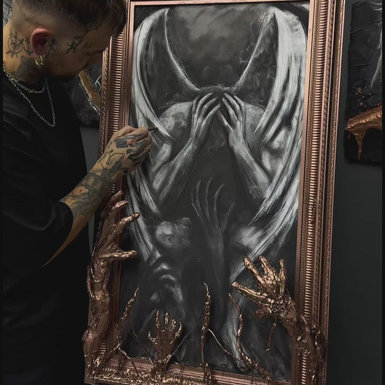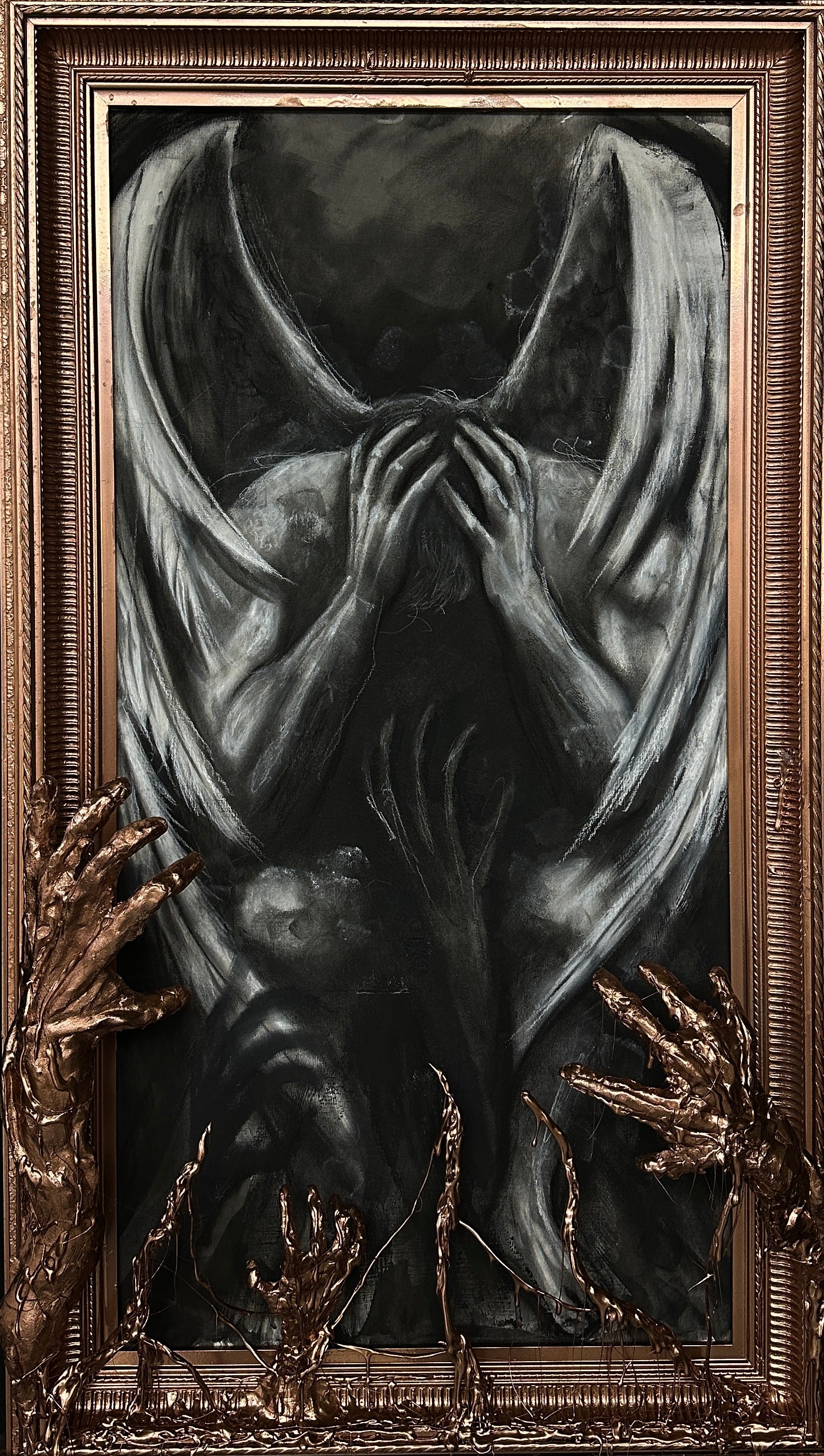 Dieses eindrucksvolle Werk verbindet Malerei und Skulptur zu einer düsteren, emotional aufgeladenen Komposition. Die zentrale Figur – ein geflügeltes Wesen, dessen Gesicht in den Händen verborgen liegt – vermittelt eine kraftvolle Mischung aus Verletzlichkeit, innerem Kampf und metaphysischer Präsenz. Die monochrome Darstellung in Schwarz-, Grau- und Weißtönen erzeugt eine atmosphärische Tiefe, die den Blick unweigerlich fesselt.