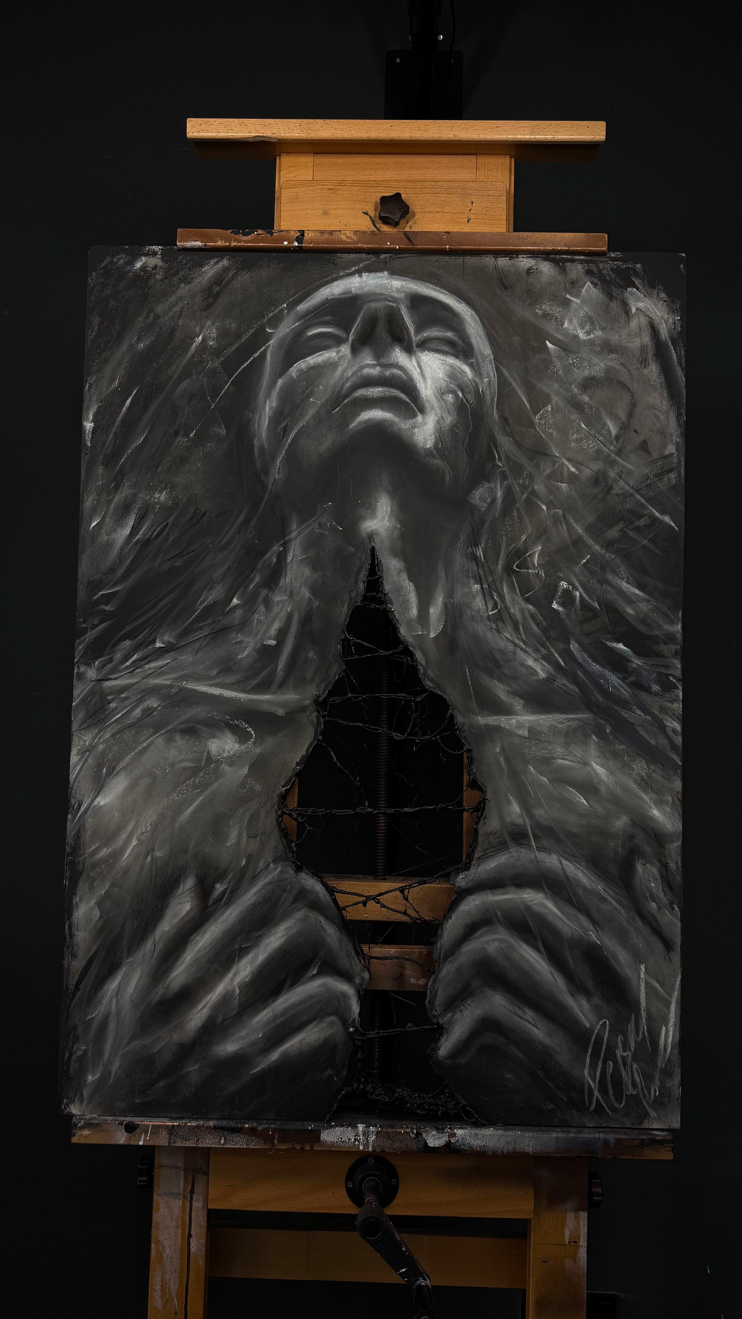 Ein Porträt zwischen Ekstase und Zerfall. Die Figur reißt ihren eigenen Körper auf - darunter Leere, Dunkelheit, Struktur. Ausdruck von innerem Druck, Selbstzweifel und dem Moment, in dem man sich selbst am meisten im Wg steht.