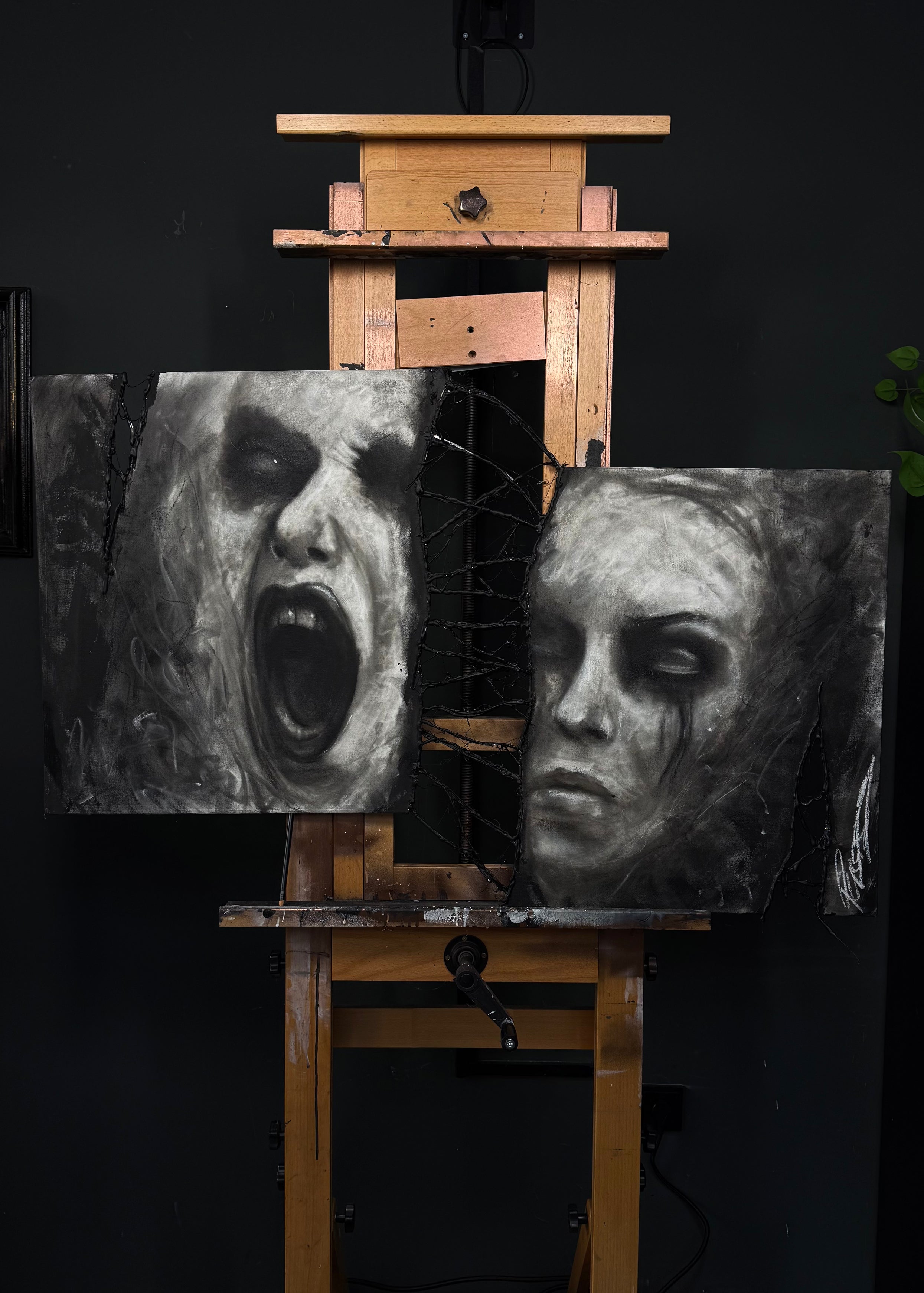 Dieses mehrteilige Schwarz-Weiß-Werk zeigt zwei gegensätzliche emotionale Zustände: einen rohen, offenen Schrei und ein stilles, in sich gekehrtes Gesicht mit dunklen Tränen.